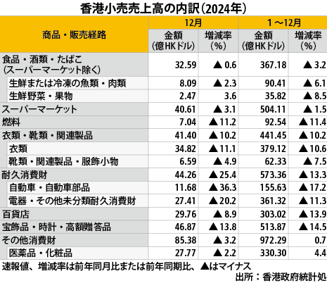 24年通年の小売売上高は前年比7.3%減の3,767億8,300万HKドルだった。前年の16.2%増から2年ぶりにマイナス転換した。