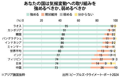 また、国連開発計画(UNDP)と英オックスフォード大学が主導し、23~24年に77カ国・地域の7万3,765人に実施した気候意識調査「ピープルズ・クライメート・ボート」では、「あなたの国は気候変動への取り組みを強めるべきか、弱めるべきか」との設問に対し、80%の人が「強めるべき」と回答した。特に、ラオス、カンボジア、バングラデシュ、インドネシア、ミャンマーといった新興国で回答割合が高かった。"