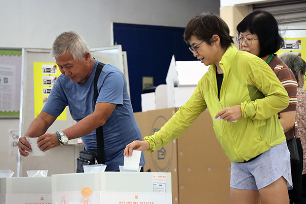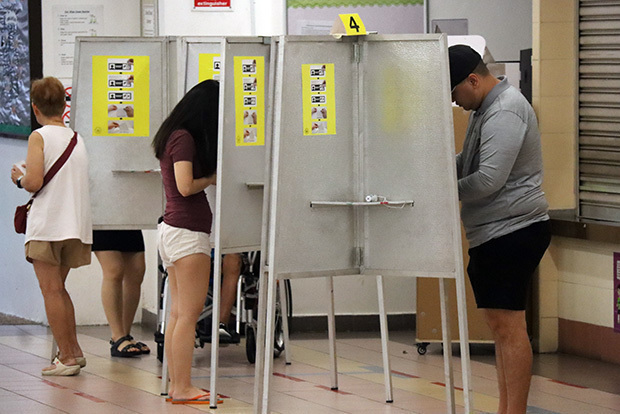 投票箱に用紙を投入する有権者ら=3日、シンガポール中央部(NNA撮影)