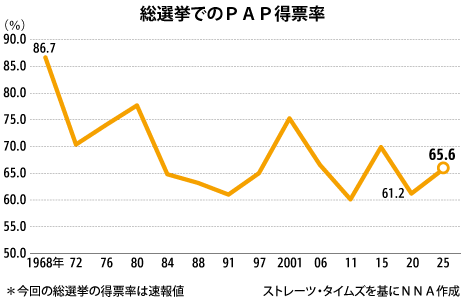 PAPは前回総選挙で得票率が61.2%となり、前々回15年の69.9%から大幅に低下していた。今回は65.6%で前回を4ポイント超上回り、議席数は改選前の83議席から4議席増えて87議席となった。地元紙は「PAPの地滑り的勝利」と報じた。