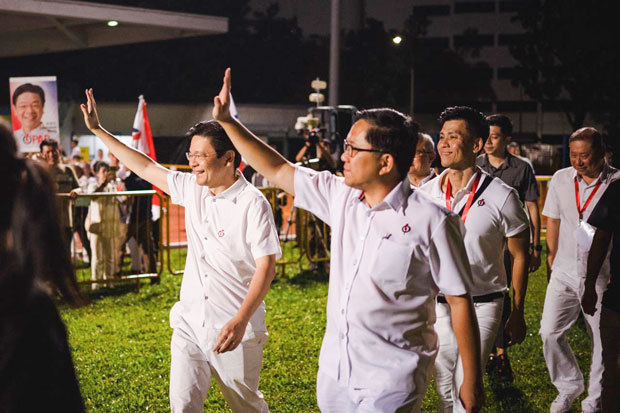 総選挙でのPAPの勝利を受けて支持者らに手を振るウォン首相(左端、PAPの公式フェイスブックより)[/caption]