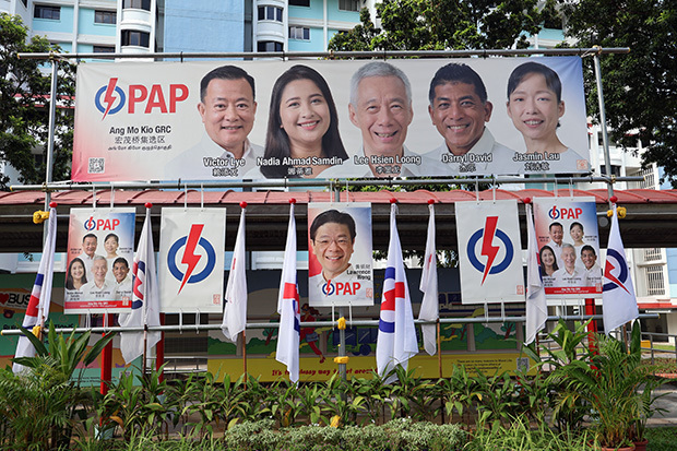 選挙活動で設置されたPAPの横断幕。上部中央にリー・シェンロン上級相、その下にウォン首相の写真がある=3日、シンガポール中央部(NNA撮影)[/caption]"