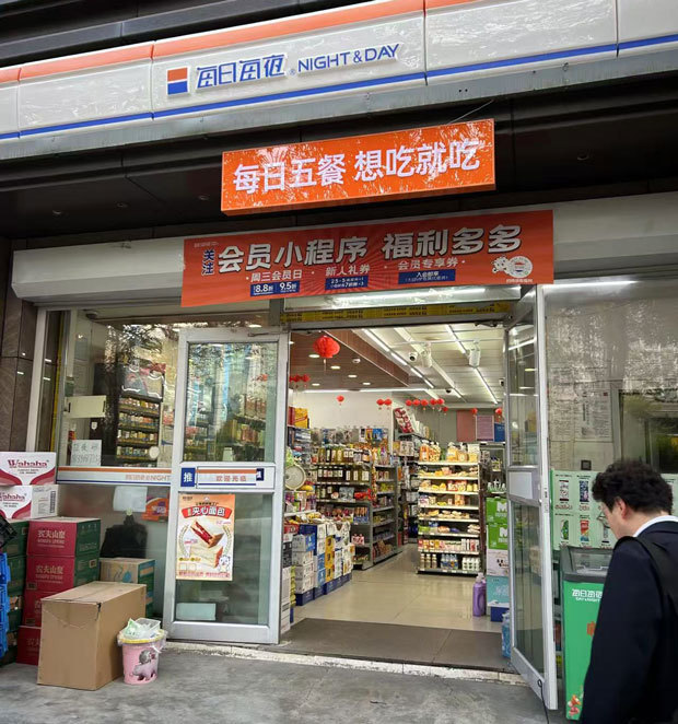 中国の地方都市にはさまざまなローカルコンビニブランドが存在する。写真はウルムチ市を中心に400店展開する「毎日毎夜」。同店の商品棚にもおにぎりが並ぶ