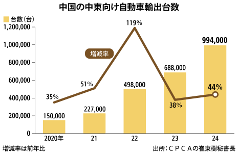 中国から中東向けの自動車輸出台数は増加している。中国の自動車業界団体、全国乗用車市場信息聯席会(CPCA)の崔東樹秘書長によると、24年の中東向け輸出台数は前年比44%増の約99万4,000台に上った。今年1~4月は前年同期比43%増の約38万5,000台と高い伸び率を維持している。