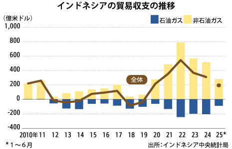 string(6809) "インドネシア中央統計局が1日公表した最新の貿易統計で、2025年上半期(1~6月)の貿易収支は黒字幅が前年同期から約25%増の194億7,900万米ドル(約2兆8,800億円)だった。貿易黒字は11半期連続で、前年同期を上回ったのは5半期ぶり。好調な米欧向け輸出がけん引したが、今後はトランプ米政権による「相互関税」の影響を受ける可能性がある。経済専門家からは、年後半にも黒字幅が縮小するとの見方も出る。
