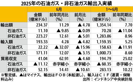 インドネシア中央統計局が1日公表した最新の貿易統計で、2025年上半期(1~6月)の貿易収支は黒字幅が前年同期から約25%増の194億7,900万米ドル(約2兆8,800億円)だった。貿易黒字は11半期連続で、前年同期を上回ったのは5半期ぶり。好調な米欧向け輸出がけん引したが、今後はトランプ米政権による「相互関税」の影響を受ける可能性がある。経済専門家からは、年後半にも黒字幅が縮小するとの見方も出る。