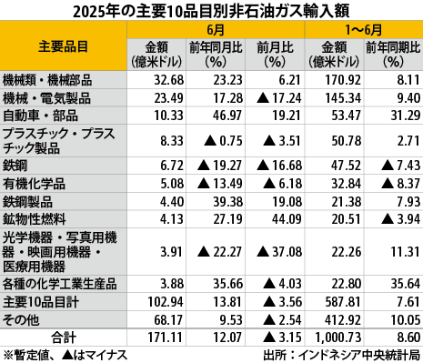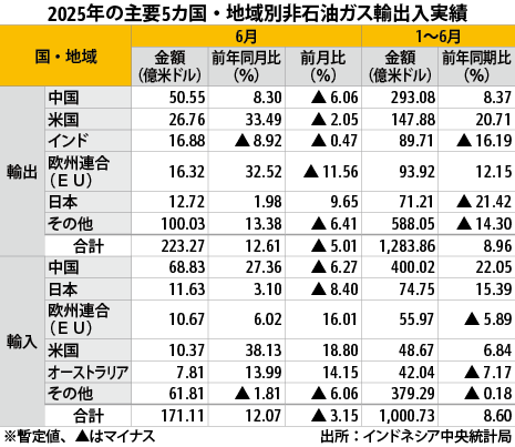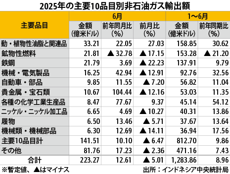 1~6月の非石油ガスの輸出を品目別で見ると、パーム油など「動・植物性油脂と関連品」が30.62%増の158億8,500万米ドルで最大。これに◇石炭など「鉱物性燃料」=21.20%減の153億2,800万米ドル◇「鉄鋼」=9.79%増の137億9,100万米ドル◇「機械・電気製品」=32.56%増の92億7,600万米ドル◇「自動車・部品」=11.04%増の56億8,200万米ドル——などが続いた。