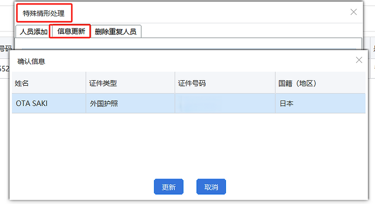 審査・登録が完了すると、個人所得税の申告システムにも自動的に反映されます。 ただし、就労先の会社も、同システム内で最新情報と税務局のデータを同期させる必要があります。 会社側では、システム上で「特殊情形処理(特殊ケース処理)」をクリックし、「信息更新(情報更新)」を選択。表示された個人情報のうち、更新が必要な項目を選択し「更新ボタン」をクリックすれば、情報がアップデートされます。 これで手続きは完了です。 以下の画面は、実際の情報更新手続き画面の例です。