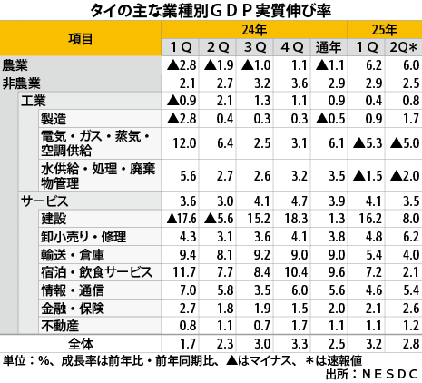 タイ国家経済社会開発委員会(NESDC)が18日発表した2025年第2四半期(4~6月)の実質国内総生産(GDP)速報値は前年同期比2.8%増加した。伸び率は第1四半期(1~3月)の3.2%(改定値)から減速。輸出が堅調だった一方、観光関連分野の減速が重しとなり消費が伸び悩んだ。東南アジア主要国の中でも最低の伸び率にとどまり、成長ペースが鈍化したのはタイのみとなった。
