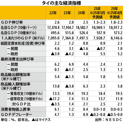 NESDCは25年通年の経済成長率の見通しについて、5月時点の1.3~2.3%から1.8~2.3%に変更した。中間値は2.0%とし、前年実績の2.5%から減速するとの予測を示した。米関税措置の実施に伴い、年後半に輸出量が減少すると見込む。観光産業が減速する中、製造業に下押し圧力がかかると指摘した。