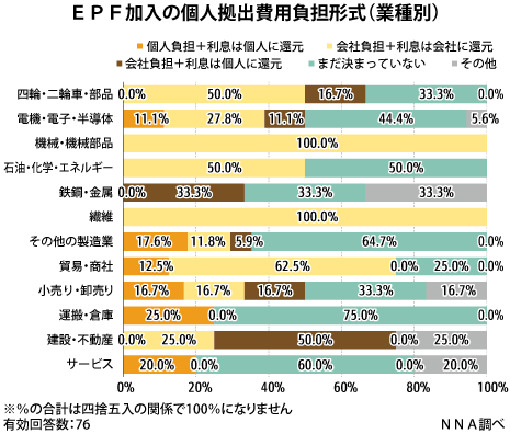 今回のEPFの加入義務化に合わせて、NNAが8月4~18日に独自に実施したアンケートでは、雇用企業に課せられた2%の法定拠出分とは別に、駐在員の加入についての従業員側拠出分の取り扱い方針を聞いた。