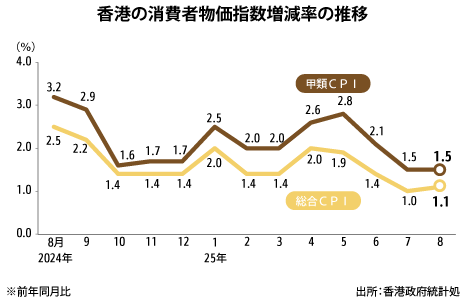人口の半数を占める中低所得世帯(月平均支出6,500~2万7,999HKドル=約12万3,700~53万2,900円)を対象に算出した甲類消費者物価指数(甲類CPI、A類CPI)は1.5%の上昇で、上昇率は前月から横ばいだった。