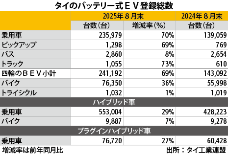 タイ工業連盟(FTI)が23日に発表した2025年8月のバッテリー式電気自動車(BEV)の新規登録台数は、前年同月比49%増の9,903台だった。