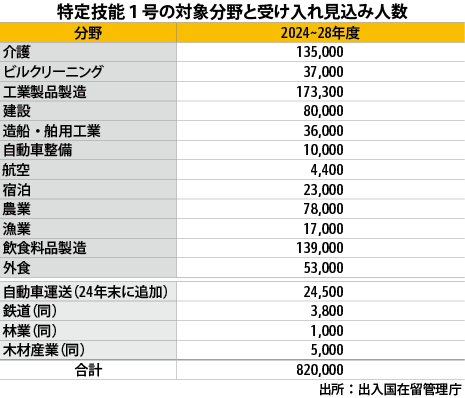 <メモ>特定技能 日本国内の深刻化する労働力不足に対処するため、2019年に即戦力となる外国人労働者を受け入れるために創設された在留資格を指す。最長5年働ける「1号」は当初の工業製品製造業、介護、建設、農業、外食など12分野に加え、24年末に自動車運送業、鉄道、林業、木材産業の4分野が加えられた。配偶者や子どもの帯同が認められ、条件を満たせば永住も可能な「2号」は24年末の新規4分野などを除く11分野に限られる。今後は「2号」の対象が4分野にも拡大されることが期待される。出入国在留管理庁によると、25年5月末の特定技能在留外国人数(1、2号含む)は約32万4,000人。政府は24~28年度の5年間で82万人を上限に受け入れる方針を掲げる。"