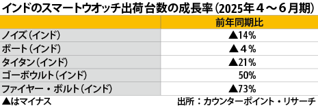 string(3661) "インドのスマートウオッチの2025年4~6月期の出荷台数(輸入品含む)は前年同期比27%減だった。減少は5四半期連続。市場シェアが最も大きい3,000ルピー(約5,000円)未満の低価格帯製品の出荷台数が急激に減少し、全体の出荷台数の減少に影響した。メーカー別の出荷台数シェアは、5四半期連続で地場ノイズが首位だった。