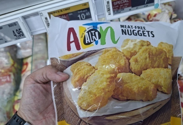 シンガポールのスーパーの一角に並ぶ肉不使用のナゲット(NNA撮影)