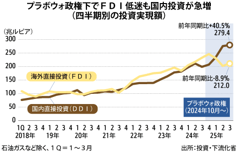 インドネシアのプラボウォ政権が発足してから20日で1年になる。2045年に先進国入りを目指すビジョン「黄金のインドネシア2045」達成に向けた政策にまい進しているが、内実を見ると内政、外交ともに多くの難題に直面。経済面では8%成長を掲げて改革に着手したが、ここに来て海外直接投資(FDI)が落ち込み、国内直接投資(DDI)が主導になりつつある。FDIの誘致を図りつつ、新政権下で始動した政府系投資ファンドを成長エンジンとしたい考えだが、規制緩和など長年の課題が残ったままで成長軌道を描けるかどうかは不透明だ。
