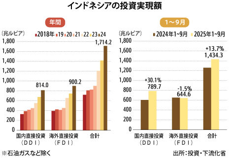 第3四半期(7~9月)の実績は、総額が13.9%増の491兆4,000億ルピア。内訳はDDIが40.5%増の279兆4,000億ルピアだったのに対し、FDIは8.9%減の212兆ルピアと2四半期連続でマイナスを記録した。