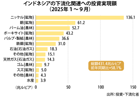 ロサン投資・下流化相は、17日の最新の投資実現額の発表で胸を張った。1~9月の実績は前年同期比13.7%増の1,434兆3,000億ルピア(約12兆9,500億円)で、200万人近い雇用が創出されたと報告。このうち下流化(高付加価値化)関連が58.1%増の431兆4,000億ルピアと高成長を記録したとアピールした。