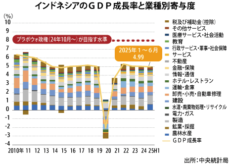 プラボウォ政権は、ジョコ・ウィドド前政権が掲げた、45年までに先進国入りを目指す「黄金のインドネシア」の達成に向けて成長加速を急ぐ。同年は独立100周年にあたり、「儀式的な意味合いが強い目標」(インドネシア大学経済社会研究所=LPEM=のリフキー研究員)ではあるが、若い労働力が豊富なうちに高成長を遂げなければならないという焦りが背景にあるのも事実だ。