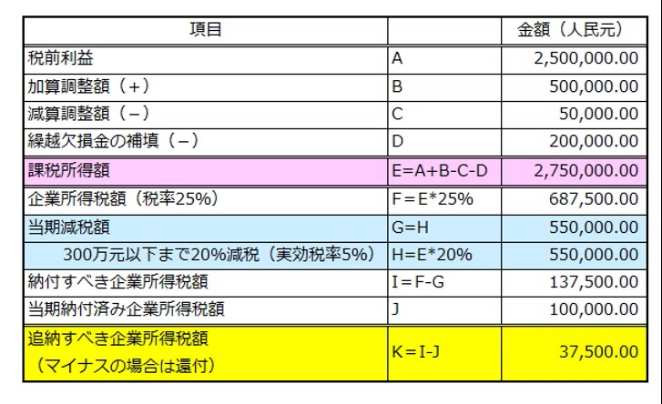 課税所得額が算出された後、その金額に企業所得税率を乗じて、企業所得税額を算出します。 近年、中国では企業所得税に関する各種の減税政策が実施されており、対象となる企業は、当該事業年度に適用される政策に基づいて減税額を計算します。算出された企業所得税額からこの減税額を控除した金額が、その年度に実際に納付すべき企業所得税額となります(上表のI欄)。