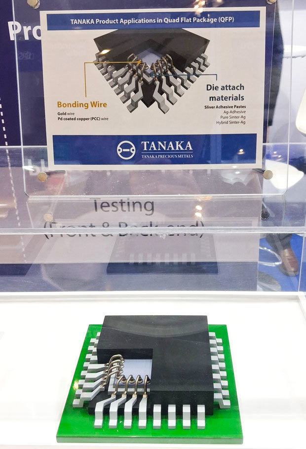 田中貴金属が世界シェア約3割を握りトップクラスのボンディングワイヤに関する展示=9月、「セミコン・インディア2025」会場(NNA撮影)[/caption]