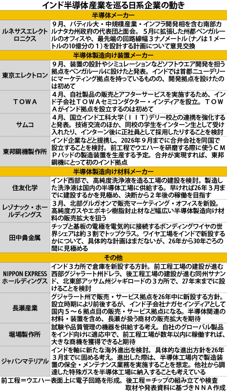 インドでは現在、大規模な半導体工場は1つも稼働していないが、前工程(ウエハー表面上に電子回路を形成)で1工場、後工程で9工場の新設計画が進む。後工程工場については26年以降、地場タタ・グループなど各社が順次稼働させる見込み。26~30年の間に、各社の生産量は大幅に増えるとみられる。