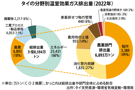 タイ天然資源・環境省の気候変動・環境局(DCCE)が公表した22年のタイの温室効果ガス排出量(土地利用・土地利用変化と林業=LULUCF=除く)は約3億8,600万トンで、農業部門は全体の18%を占める。
