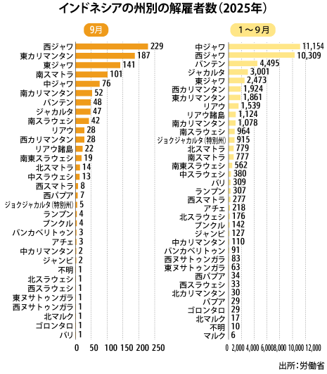 1~9月の解雇者数は4万5,426人。前年同期の5万4,400人から約9,000人減った。州別では中ジャワ州が1万1,154人で最多となり、西ジャワ州が1万309人で続いた。