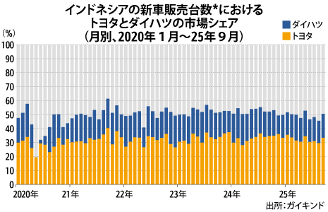 インドネシア自動車製造業者協会(ガイキンド)によると、同期間の卸売りベースの新車販売台数は11.3%減の56万1,819台。このうち販売シェア首位のトヨタ車は12.7%減の18万1,817台(シェアは0.5ポイント低下の32.4%)、ダイハツ車は24.3%減の9万5,307台(同2.9ポイント低下の17.0%)だった。近年は中国系ブランドが電気自動車(EV)などで攻勢に出る中、トヨタ車が堅調に推移する一方、ダイハツ車でシェア低下が見られるという。