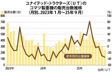UTのコマツ製重機の販売台数は10%増の3,653台。ただ、月別では8月と9月の2カ月連続で前年同月を2桁下回った。