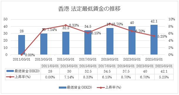 string(1533) "香港の最低賃金制度は2011年5月1日より施行され、2年に1回見直しされてきました。法定最低賃金はヘ ルパー (性別、人種、国籍問わず) や条例に定められた研修中の学生などは適用除外となります。 香港政府は2025年5月1日に本件(注1)に関する下記の内容を発表しました。