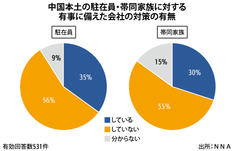 駐在員・帯同家族に対する有事に備えた会社の対策の有無を聞く設問では、「していない」が全体の5割台で、「している」の3割台を上回った。