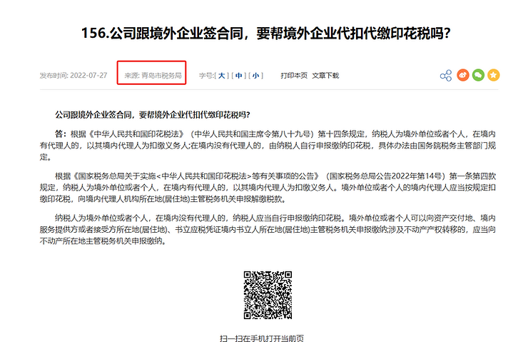 ① 国外に所在する組織または個人に中国国内の代理人がいる場合:その代理人が印紙税の源泉徴収義務者となり、所定の方法で印紙税を徴収・納付します。納付先は、代理人の所在地(または居住地)を管轄する税務局です。