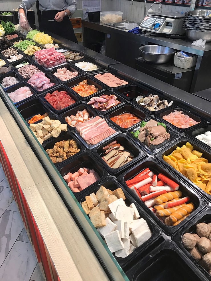 野菜、肉、キノコ、練り物など、ショーケースにはズラリと具材が並び、好きなものをトングで選ぶスタイル。見ているだけでもテンションが上がります!