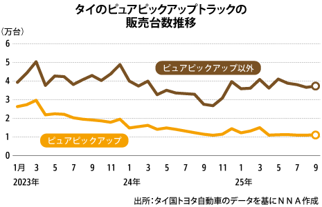 タイの1~9月の新車販売台数は前年同期比2.1%増の44万7,969台だった。上向いているものの、本格回復とは言い切れない。日系ブランドのシェアが高いピックアップトラック市場の落ち込みが続いているためだ。ピックアップトラックをベースにした乗用車「乗用ピックアップ(PPV)」を除いた従来型のピックアップトラック(ピュアピックアップ)の販売台数は、15.3%減の10万7,150台。ピュアピックが新車販売台数全体に占める割合は24%で、2022年1~9月の46%から半減している。