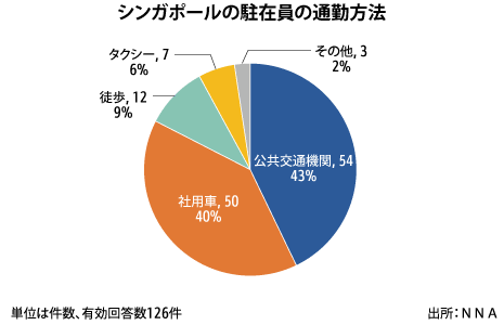 通勤方法に関する質問(複数回答可)では、126件の有効回答数のうち「公共交通機関」が54件と最多だった。公共交通機関の利用率は約4割で、東南アジアの中では突出して高かった。このほかの通勤手段は「社用車」が50件、「タクシー」が7件、「その他」が3件。生活圏の狭さを反映してか「徒歩」も12件あった。業種別では、「機械・機械部品」「小売・卸売」「食品・飲料」で社用車が使われる傾向が見られた。